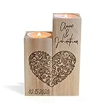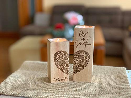 Personalized engraved wooden candle holder with custom names.