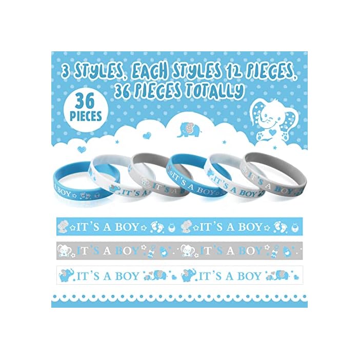 36 Pieces Wristbands: you’ll receive 36 pieces of gender reveal rubber wristbands in total, designed with 3 different styles, 12 pieces for each and every style, enough quantity to meet your quite a lot of kinds of needs and replacement, daily use or party favors; Baby shower boy wristbands feature with different signs, allowing your guests to recall moments after the party